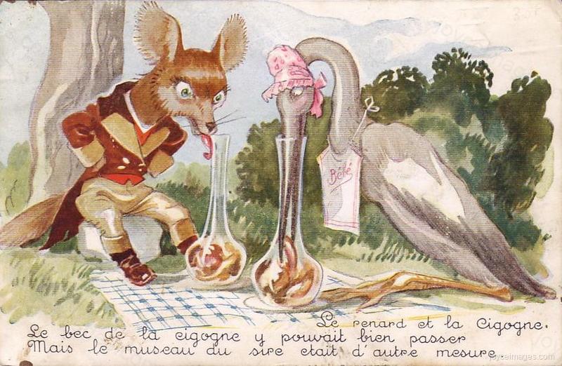 - Ah fox met ah stork. Said thee fox too thee stork: Will you put your bill down inn my troath and pull upp ah bone?" (U11.246)