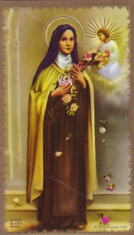 S. Thérèse of Lisieux, aka Teresa of the Child Jesus, or the Little Flower (1873 - 1897) was the ninth child of saintly middle class French parents, Louis and Zélie Martin (five of their daughters became nuns). In 1888, at the unusual age of fifteen, Thérèse Martin entered the Carmelite convent of Lisieux where two of her sisters had preceded her. She died in 1897 of tuberculosis and was canonized in 1925. She is represented as a Carmelite nun, usually with roses in her arms or at her feet. Feast October 1.