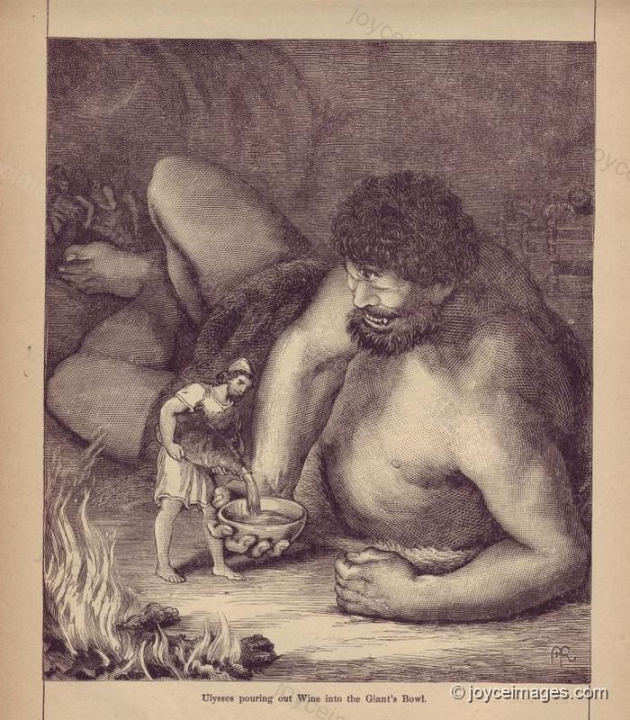 This engraving (1886) shows Ulysses pouring out wine into the Giant's Bowl.