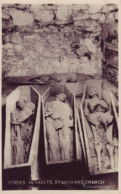 In the vaults of St Michan's church lie a number of bodies mummified by the dry sterile atmosphere created by the church's limestone walls. Some of the wooden caskets have cracked open, revealing the dead, as in life they slept, complete with skin and strands of hair.