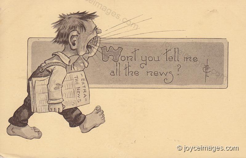 "By screens of lighted windows, by equal gardens a shrill voice went crying, wailing: Evening Telegraph, stop press edition! Result of the Gold Cup races! and from the door of Dignam's house a boy ran out and called. Twittering the bat flew here, flew there. Far out over the sands the coming surf crept, grey." (U13.1173)