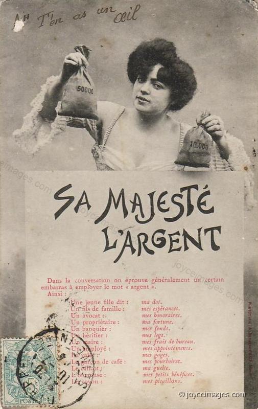 "Suppose he gave her money. Why not? All a prejudice. She's worth ten, fifteen, more, a pound. What? I think so. All that for nothing. Bold hand: Mrs Marion. Did I forget to write address on that letter like the postcard I sent to Flynn? And the day I went to Drimmie's without a necktie. Wrangle with Molly it was put me off. No, I remember. Richie Goulding. He's another. Weighs on his mind." (U13.841)