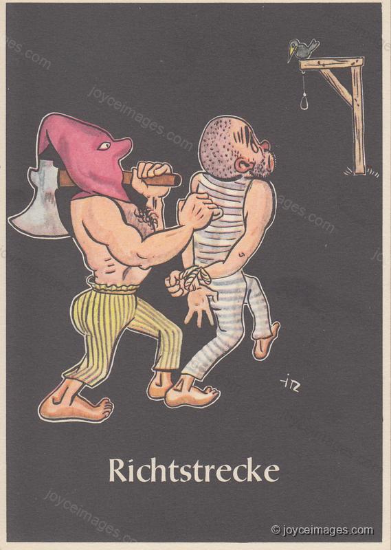 "(H. Rumbold, master barber, in a bloodcoloured jerkin and tanner's apron, a rope coiled over his shoulder, mounts the block. A life preserver and a nailstudded bludgeon are stuck in his belt He rubs grimly his grappling hands, knobbed with knuckledusters.)