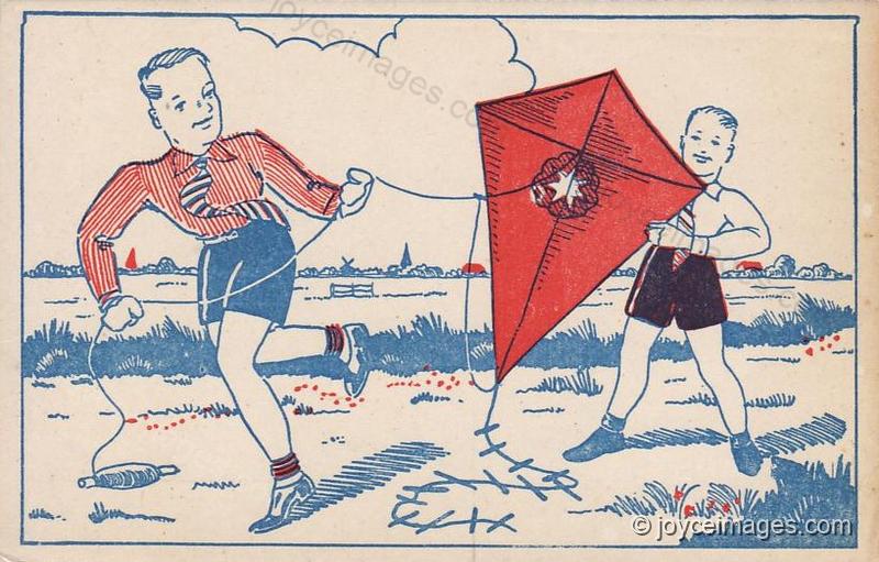"(Ragged barefoot newsboys, jogging a wagtail kite, patter past, yelling.)