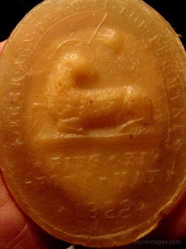 From CE 1907: "The name Agnus Dei has been given to certain discs of wax impressed with the figure of a lamb and blessed at stated seasons by the Pope. They are sometimes round, sometimes oval in diameter. The lamb usually bears a cross or flag, while figures of saints or the name and arms of the Pope are commonly impressed on the reverse. These Agnus Deis may be worn suspended round the neck, or they may be preserved as objects of devotion. In virtue of the consecration they receive, they are regarded, like holy water, blessed palms etc, as Sacramentals." The making and consecration of Agnus Dei traditionally took place during the Holy Week, in the 1st year of a new pope's pontificate, then every 7th year he remained in office. The wax used was the collected remnants of paschal candles from the Sistine and other chapels. The picture shows an Agnus Dei from 1922.