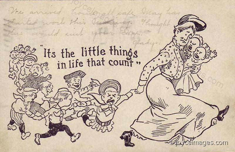 "Patsy hopping on one shod foot, his collar loose, a hank of porksteaks dangling, Freddy whimpering, Susy with a crying cod's mouth, Alice struggling with the baby. She cuffs them on, her streamers flaunting aloft.) "