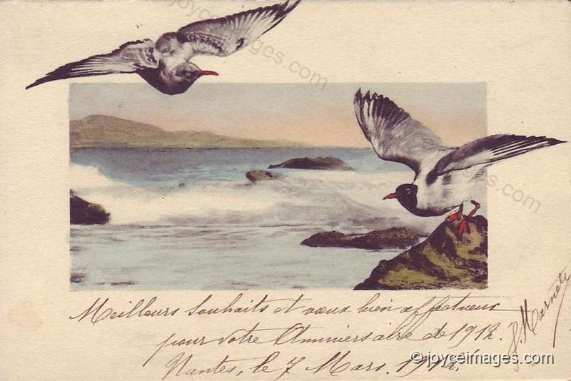 "(A covey of gulls, storm petrels, rises hungrily from Liffey slime with Banbury cakes in their beaks.)