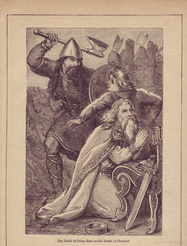 Brian Boru or Brian Boroimhe (ca 940-1014), king of Ireland. A clan prince, he succeeded his brother Mathghamhain, who had seized Munster from the Eogharacht rulers (963). Brian subjugated Munster, extended his power over all S. Ireland, and in 1002 became High King of Ireland by right of conquest. As his power increased, relations with the Norse rulers on the Irish coast, and their king Sitric, grew steadily worse. Sitric formed against Brian a coalition of the Norse of Ireland, the Hebrides, the Orkneys, Iceland, and Brian's Irish enemies. On Good Friday April 23rd 1014, Brian's forces met and annihilated the allies at Clontarf, near Dublin. Soon after this victory, however, he was attacked by the enemy and murdered in his tent, as illustrated in this print (1886).