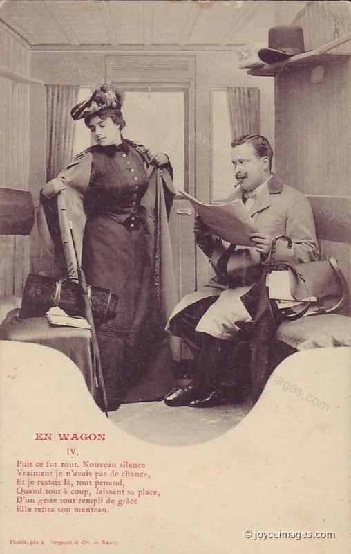 "I wonder will he take a 1st class for me he might want to do it in the train by tipping the guard well O I suppose therell be the usual idiots of men gaping at us with their eyes as stupid as ever they can possibly be" (U18.367)