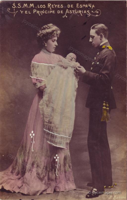 Molly is correct. Alfonso XIII of Spain, seen here as an adult with his wife and new baby, was born May 17th 1886. The birth (and sex of the baby) were anxiously awaited as his father Alfonso XII had died, and the royal couple had 2 daughters. Alfonso XIII was proclaimed King at his birth, and thus never held the Spanish title given to the heir (Infante, or Prince of Asturias). He reigned 1886 - 1931.