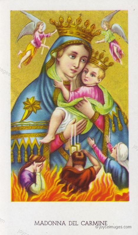 In this holy card, the scapular is held by Our Lady of Mt Carmel (it is one of her attributes). The damned are desperately, but too late, trying to reach for it. Besides the scapular, Catholic objects of personal devotion, that defend them from evil in more than two ways, include relics, the rosary, holy water, holy medals, and Agnus Dei.