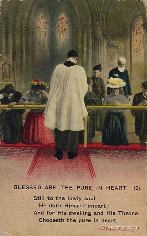 "and put it neatly into her mouth. Her hat and head sank. Then the next one. Her hat sank at once. Then the next one: a small old woman. The priest bent down to put it into her mouth, murmuring all the time. Latin. The next one." (U5.346)