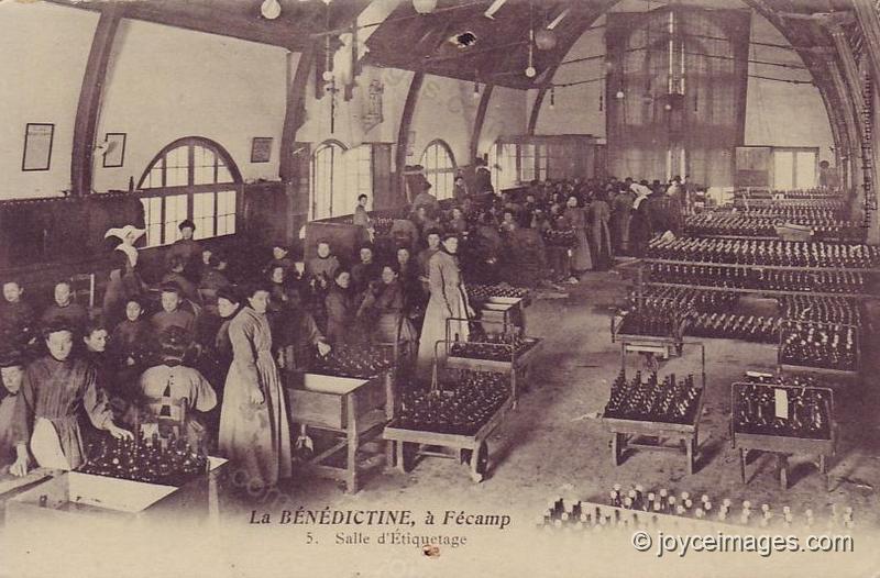 Savored at the court of King Francois 1er, Benedictine was manufactured by Benedictine monks only until the end of the 18c. The recipe was lost during the French Revolution (1789), then found again in an old manuscript (1863). Since then, the liquor is produced by a commercial company in Fécamp. This PC shows the labeling room, with nuns (supervisors?) among the workers.