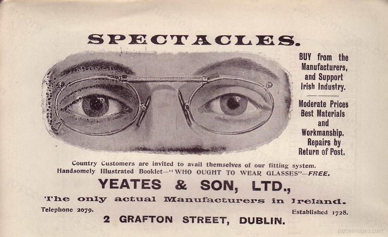 "He crossed at Nassau street corner and stood before the window of Yeates and Son, pricing the field glasses. Or will I drop into old Harris's and have a chat with young Sinclair? Wellmannered fellow. Probably at his lunch." ([U8.551])