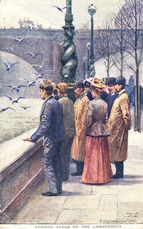 He halted again and bought from the old applewoman two Banbury cakes for a penny and broke the brittle paste and threw its fragments down into the Liffey. See that? The gulls swooped silently two, then all, from their heights, pouncing on prey. Gone. Every morsel.." (U8.73)
