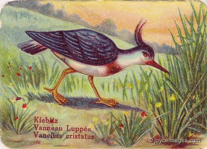 The back of the Ogden's card reads: "Lapwing (Vanellus Vulgaris). The Lapwing or Peewit, is essentially a moorland bird, being found all the year round on the bare heathery uplands. Its weird cry of "pee-wit" heard echoing over the bare moorlands at close of day strikes a remarkable sense of loneliness to the hearer. Its flight is much like that of the gull, swinging with slow beat of wing in wide circles. At times it rises rapidly in the air, and suddenly doubles back to earth, recovering itself before reaching the ground." This last characteristic, I think, is of relevance to Stephen.