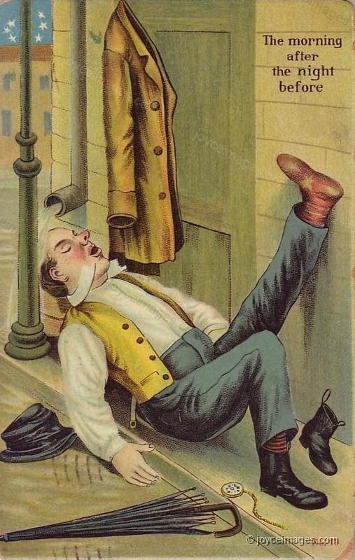 - But wait till I tell you, he said. We had a midnight lunch too after all the jollification and when we sallied forth it was blue o'clock the morning after the night before." (U10.551)
