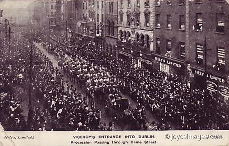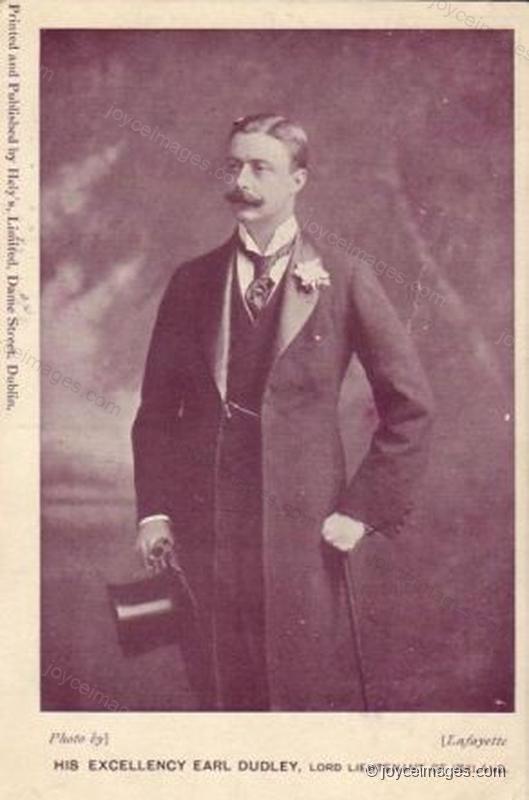 "Beyond Lundy Foot's from the shaded door of Kavanagh's winerooms John Wyse Nolan smiled with unseen coldness towards the lord lieutenantgeneral and general governor of Ireland. The Right Honourable William Humble, earl of Dudley, G.C.V.O., passed Micky Anderson's all times ticking watches and Henry and James's wax smartsuited freshcheeked models, the gentleman Henry, dernier cri James." (U10.1211)