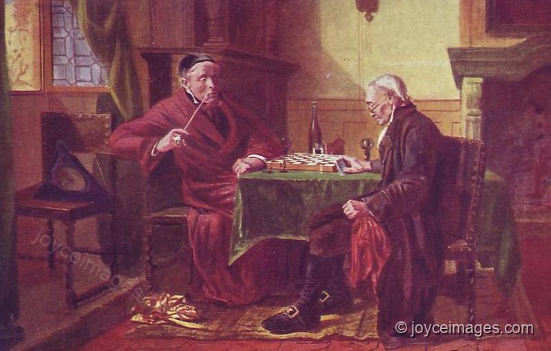 "whose mass of forms darkened the chessboard whereon John Howard Parnell looked intently. In Fownes's street Dilly Dedalus, straining her sight upward from Chardenal's first French primer, saw sunshades spanned and wheelspokes spinning in the glare. John Henry Menton, filling the doorway of Commercial Buildings, stared from winebig oyster eyes, holding a fat gold hunter watch not looked at in his fat left hand not feeling it." (U10.1225)