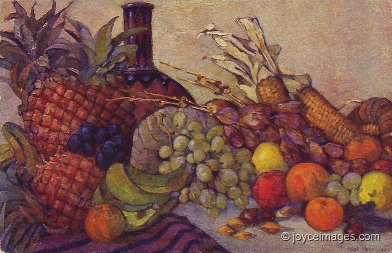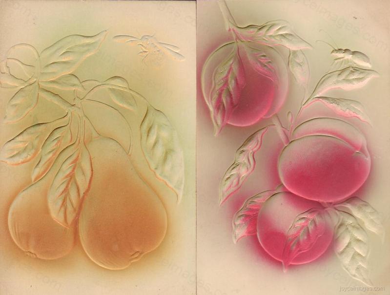 She bestowed fat pears neatly, head by tail, and among them ripe shamefaced peaches." (U10.303)