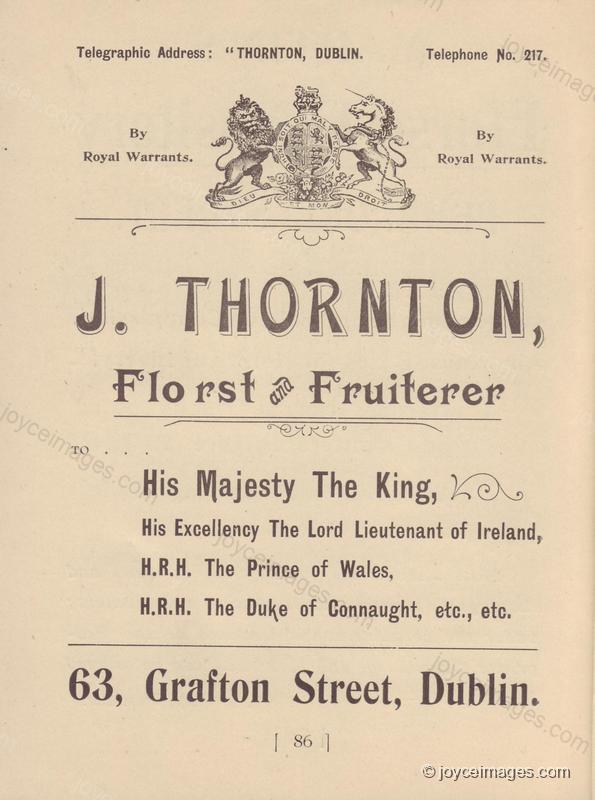 An ad for Thornton in a tourist pamphlet from 1902. We get the store's phone number 217; nowadays Dublin phone numbers have 7 digits.