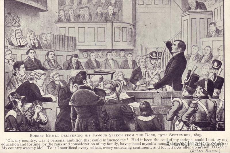 After he was sentenced, Emmet delivered a Speech from the Dock, especially remembered for its closing sentences: 'Let no man write my epitaph: for as no man who knows my motives dare now vindicate them, let not prejudice or ignorance asperse them. Let them and me repose in obscurity and peace, and my tomb remain uninscribed, until other times, and other men, can do justice to my character; -