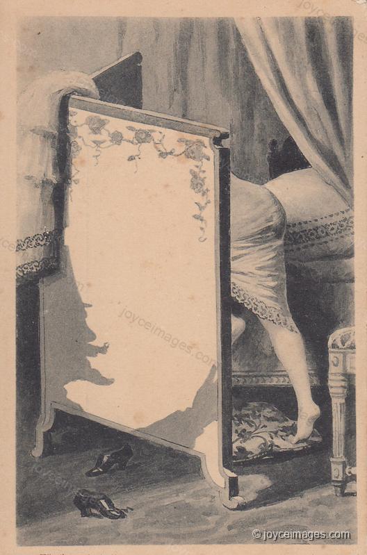 "Miss Kennedy lipped her cup again, raised, drank a sip and gigglegiggled. Miss Douce, bending again over the teatray, ruffled again her nose and rolled droll fattened eyes. Again Kennygiggles, stooping her fair pinnacles of hair, stooping, her tortoise napecomb showed, spluttered out of her mouth her tea, choking in tea and laughter, coughing with choking, crying:" (U11.163)