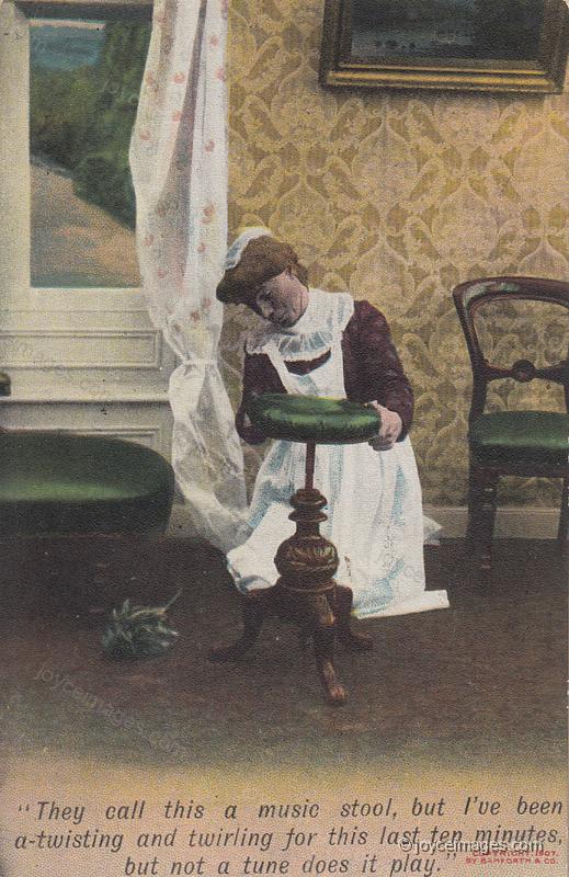 "He plumped him Dollard on the stool. His gouty paws plumped chords. Plumped, stopped abrupt." (U11.451)