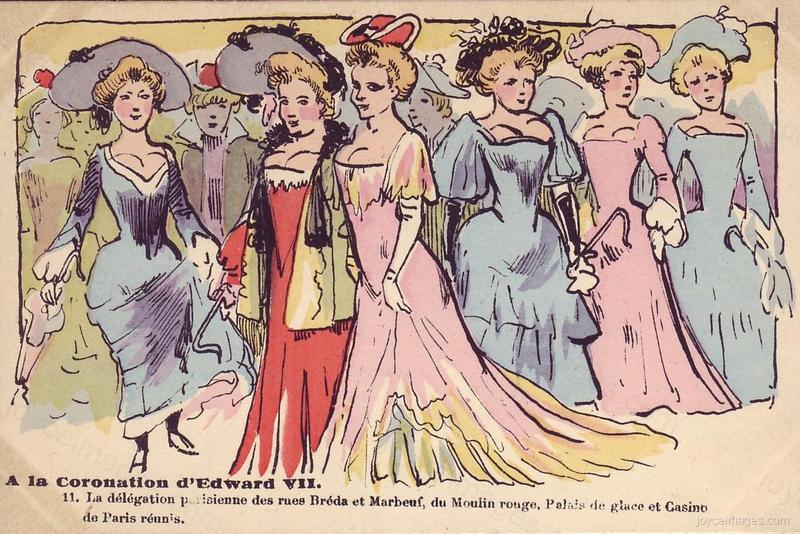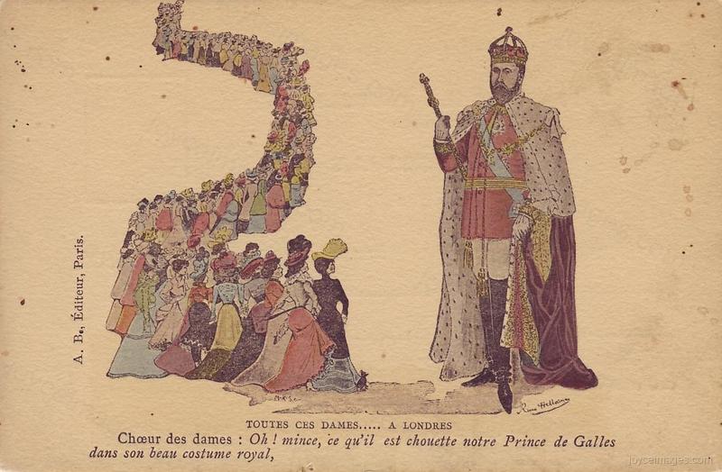 Edward was a well known womanizer. A French PC (1902) caricatures his coronation, showing the 'United Parisian Delegation' of Breda and Marbeuf streets, the Moulin Rouge, the Palace of Mirrors, and the Casino de Paris.