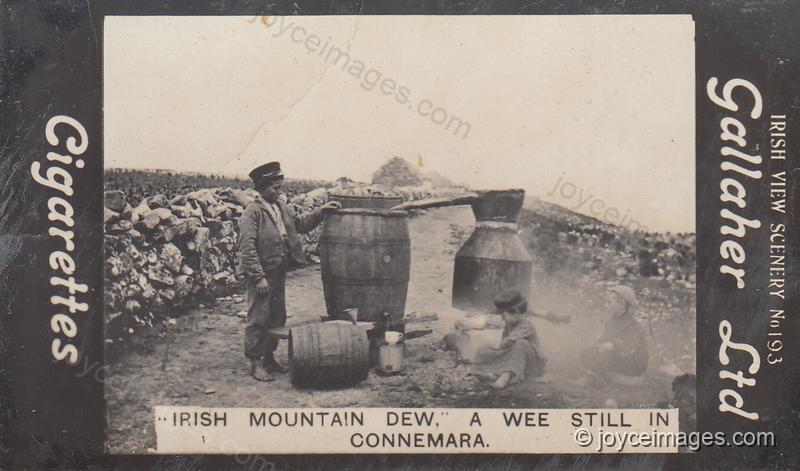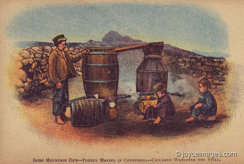 'Mountain dew' is a slang term similar to 'moonshine' = home-distilled alcohol, especially where illegal. It is made from local products such as corn, potatoes, grapes, cane sugar etc. Irish mountain dew (aka as poteen), was potato based. This PC shows a still in Connemara, with children in charge of watching it.