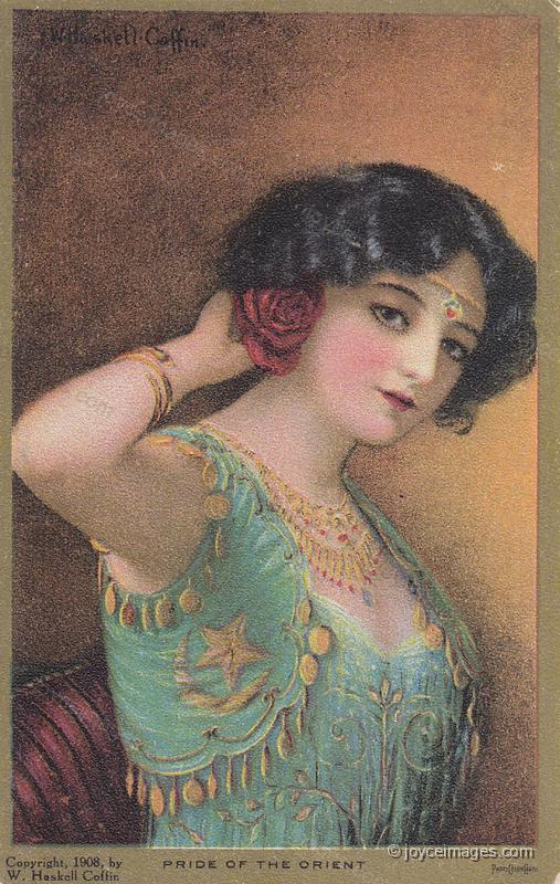 "Slowly, note by note, oriental music is played. He gazes in the tawny crystal of her eyes, ringed with kohol. His smile softens.)