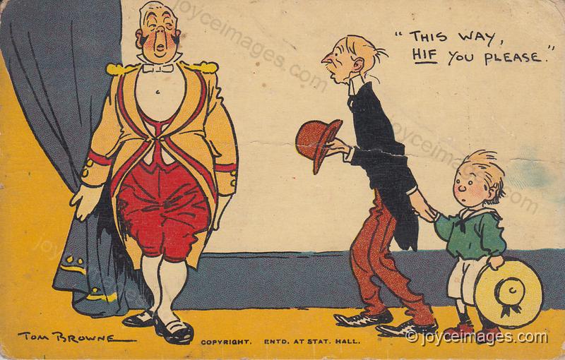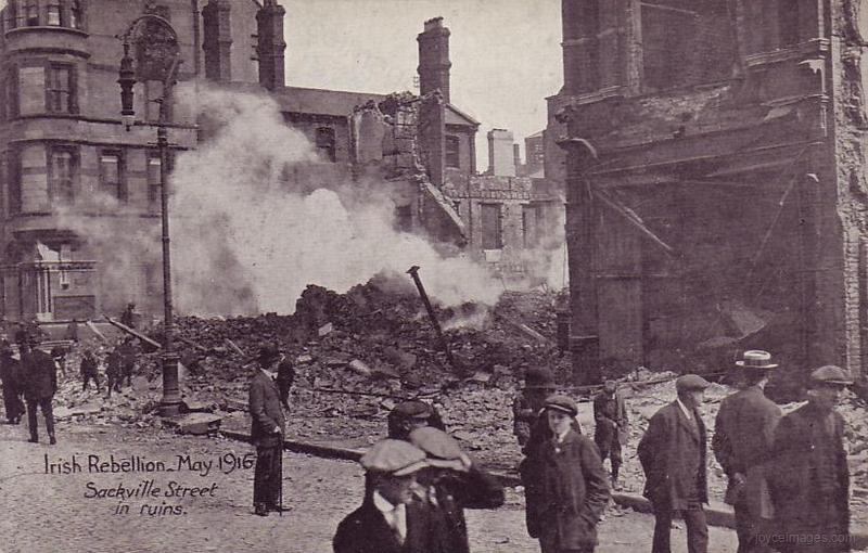 "In the course of its extension several buildings and monuments are demolished. Government offices are temporarily transferred to railway sheds. Numerous houses are razed to the ground. The inhabitants are lodged in barrels and boxes, all marked in red with the letters: L.B. Several paupers fall from a ladder. A part of the walls of Dublin, crowded with loyal sightseers, collapses.)"
