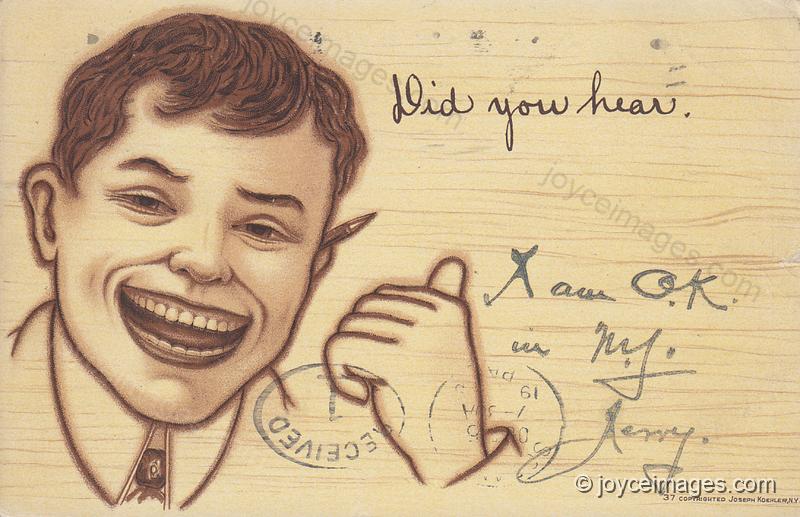 "marked made in Germany. In his left hand he holds a plasterer's bucket on which is printed Defense d'uriner. A roar of welcome greets him.)"