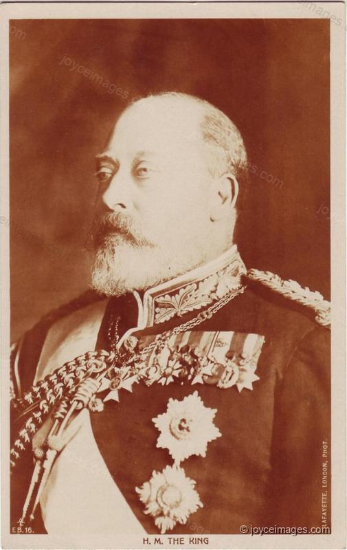 (Edward the Seventh appears in an archway. He wears a white jersey on which an image of the Sacred Heart is stitched"