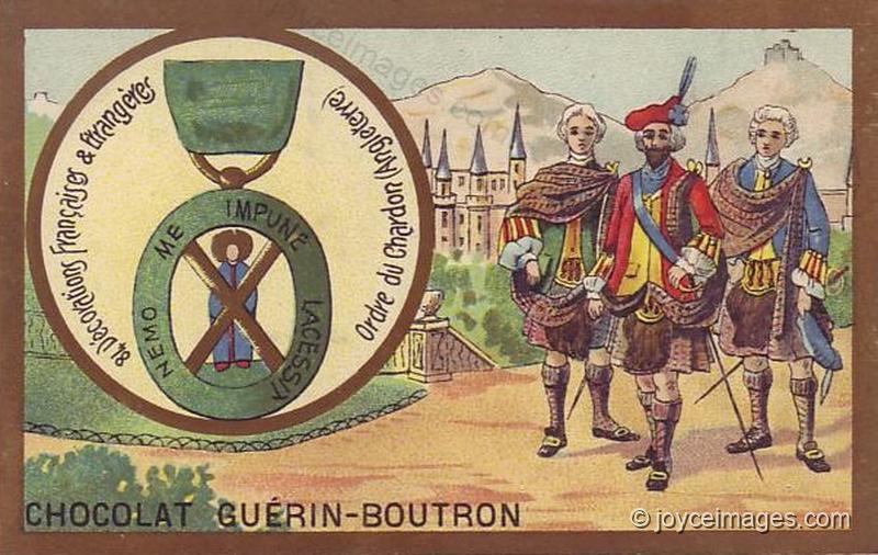 The Order of the Thistle is an order of chivalry associated with Scotland. An ancient Order, it was revived by James VII (also King of England as James II) in 1687. The Order consists of the Sovereign (who alone grants membership) and 16 (Scottish-borne) Knights and Ladies, plus "extra" knights (members of the British Royal Family, or foreign monarchs). The Order's emblem is the thistle. Its badge depicts St Andrew, wearing a green gown and purple coat, holding a saltire, surrounded by the Order's motto 'Nemo me impune lacessit' (Latin: No one provokes me with impunity). Edward was indeed a Knight of the Thistle (1867).