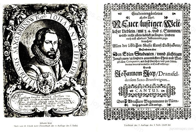 Johannes Jeep is a German composer and organist (1581 - 1644). He is especially known for his more than 100 hymn and psalm settings done mostly in four-part harmony. He also wrote an enduring set of student songs, pieces of popular music that are entirely homophonic and strophic. (Image courtesy of Harald Beck)