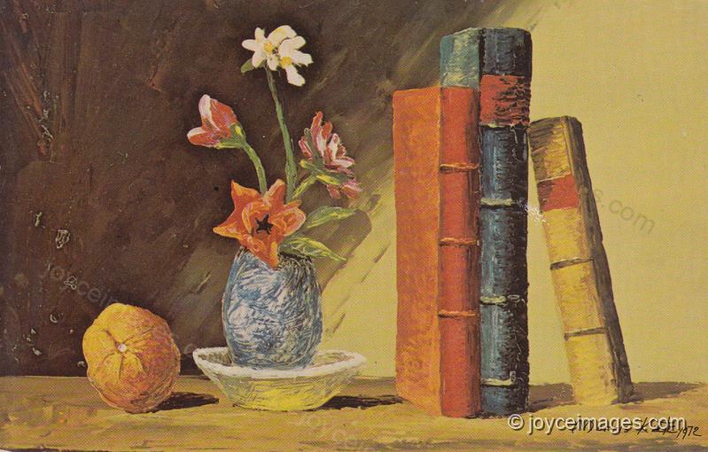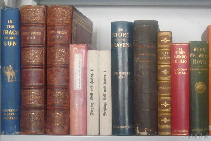 The optical reflection of several inverted volumes improperly arranged and not in the order of their common letters with scintillating titles on the two bookshelves opposite." (U17.1357)