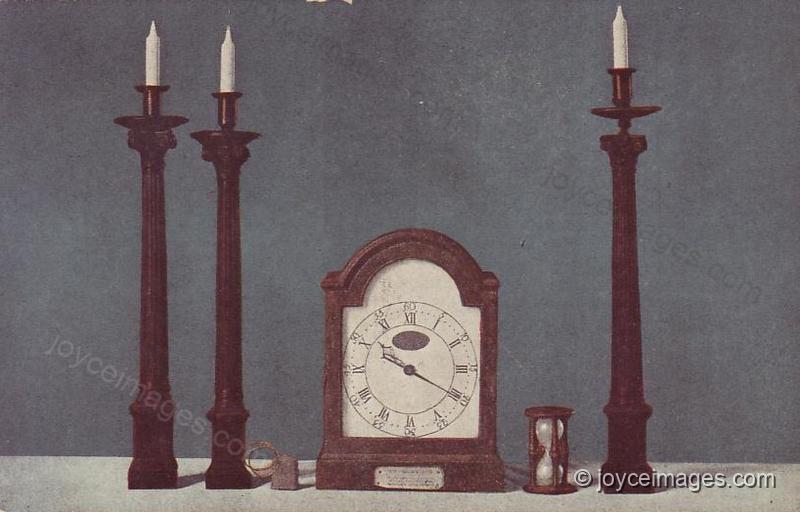 A timepiece of striated Connemara marble, stopped at the hour of 4.46 a.m. on the 21 March 1896, matrimonial gift of Matthew Dillon: a dwarf tree of glacial arborescence under a transparent bellshade, matrimonial gift of Luke and Caroline Doyle: an embalmed owl, matrimonial gift of Alderman John Hooper." (U17.1333)