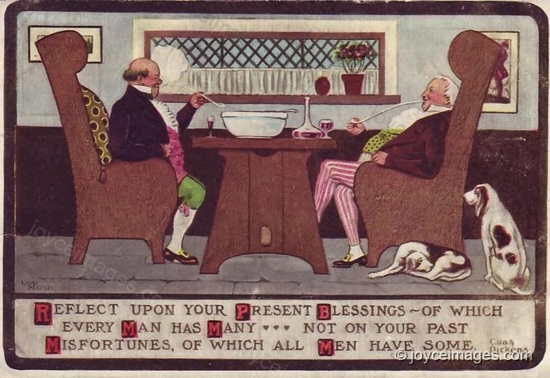"lighting their pipes for them everytime they went out drunken old devil with his grog on the windowsill catch him leaving any of it picking his nose trying to think of some other dirty story to tell up in a corner" (18.691)