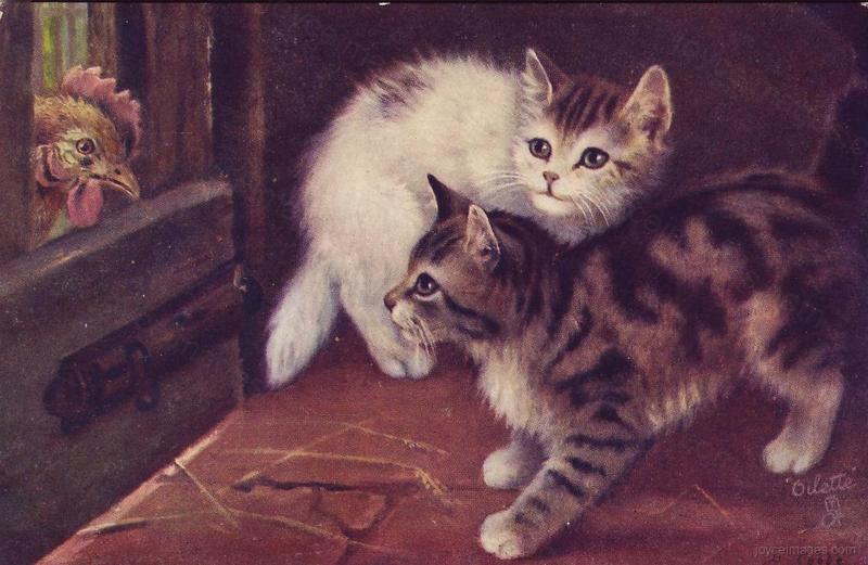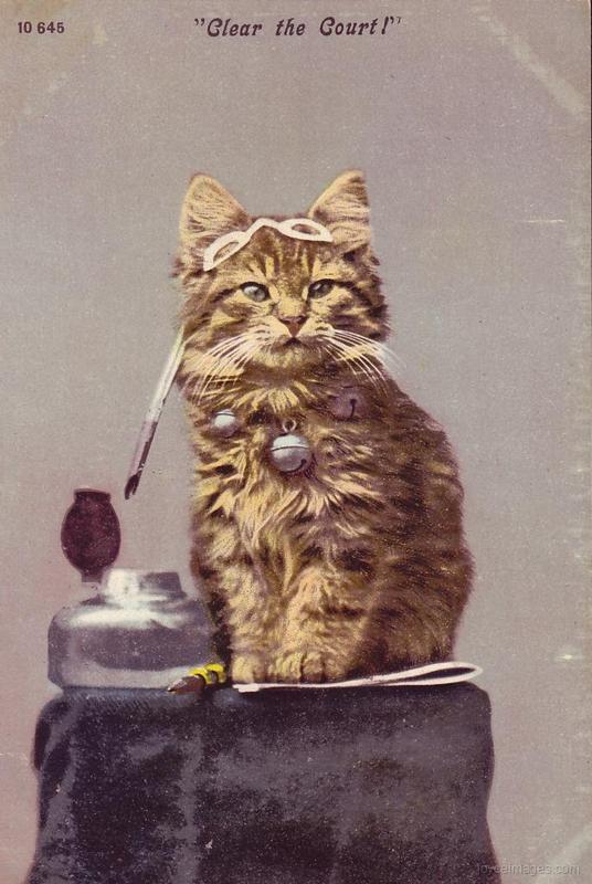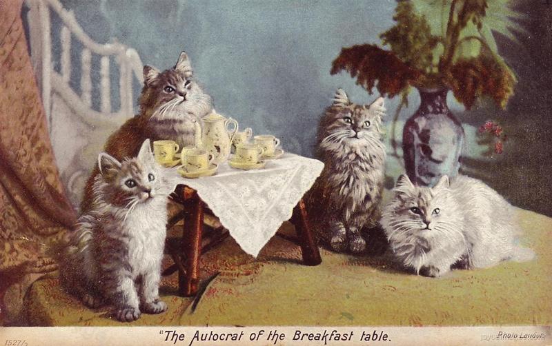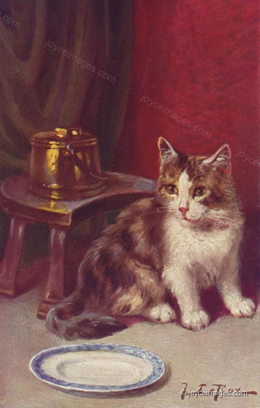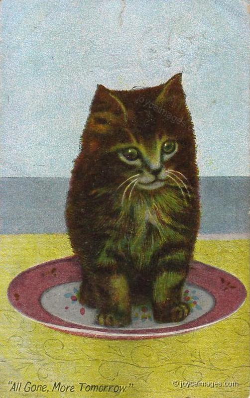 The cat mewed in answer and stalked again stiffly round a leg of the table, mewing. Just how she stalks over my writingtable. Prr. Scratch my head. Prr.
