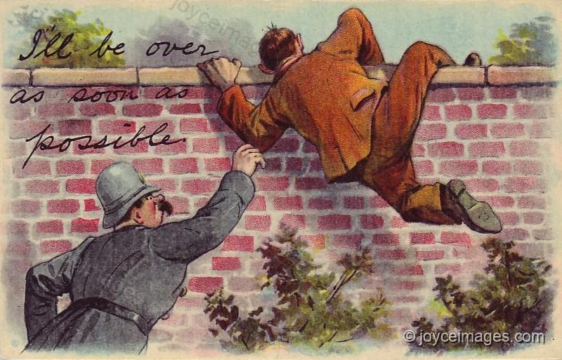 "He gazed after the last broad tunic. Nasty customers to tackle. Jack Power could a tale unfold: father a G man. If a fellow gave them trouble being lagged they let him have it hot and heavy in the bridewell. Can't blame them after all with the job they have especially the young hornies." (U8.419)