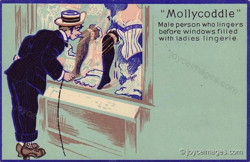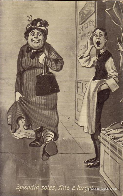 "Thick feet that woman has in the white stockings. Hope the rain mucks them up on her. Country bred chawbacon. All the beef to the heels were in. Always gives a woman clumsy feet. Molly looks out of plumb." (U8.616)